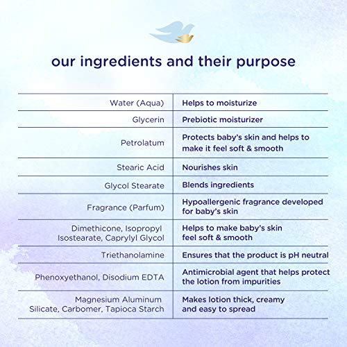 - Rich moisture: Baby Dove Rich Moisture Hypoallergenic Body Lotion (20 oz.) gently nourishes and hydrates baby’s sensitive skin after bath time, leaving it moisturized for 24 hours