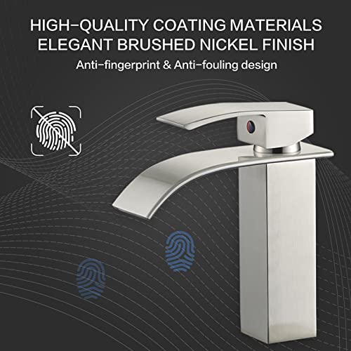 VOTON Waterfall Spout Single Handle Bathroom Faucet Brushed Nickel Commercial Modern Lavatory Tap with Pop-up Drain