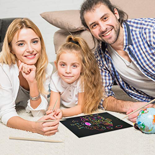 - 🌈🍒Great Value Scratch Paper Art Set: 🍓Scratch magic paper come with 50 sheets scratch sheets and 5 wooden stylus can meet your needs. you can use the stylus to scratch away to reveal the beautiful rainbow background. Let kids make outstanding handmade artworks, and keep boys and girls busy with fun DIY kids art craft project